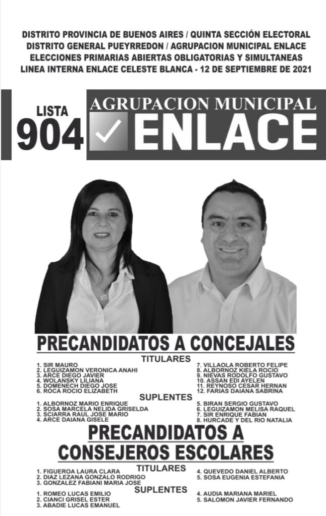 La lista Vecinal de ENLACE es la 904, lleva la imagen de los primeros dos precandidatos y tiene la particularidad de ser la única lista en blanco y negro.